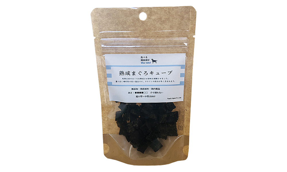 和歌山県産の生まぐろをじっくり乾燥させ旨味を凝縮させました。香り高く嗜好性の高い逸品です。小型犬でも食べやすいキューブタイプ。
